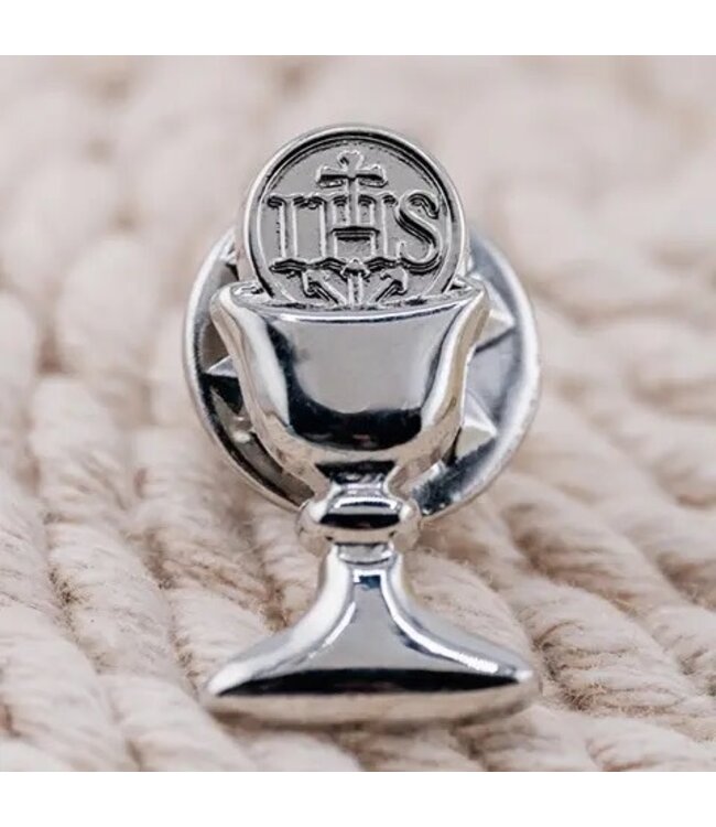 Beautiful First Communion silver chalice tie/lapel pin, packaged on a gift card with a poem about their special day. Perfect Communion Gift.