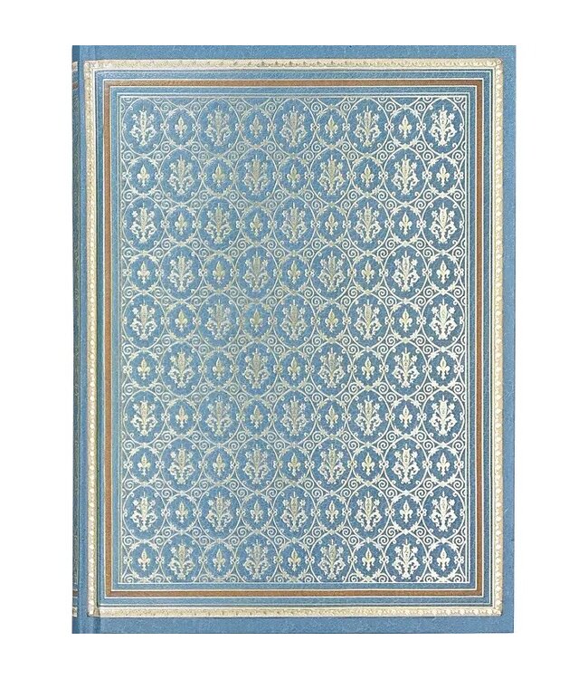 An intricately embossed pattern, with stylized fleurs-de-lis bordered in green, red, and gold, is featured on the covers of this elegant journal. 6-1/4'' x 8-1/2"