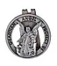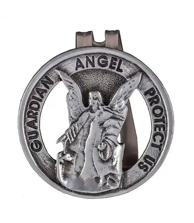 Guardian angel design auto visor clip in bright finish, cut out circle, "Protect Us" message.