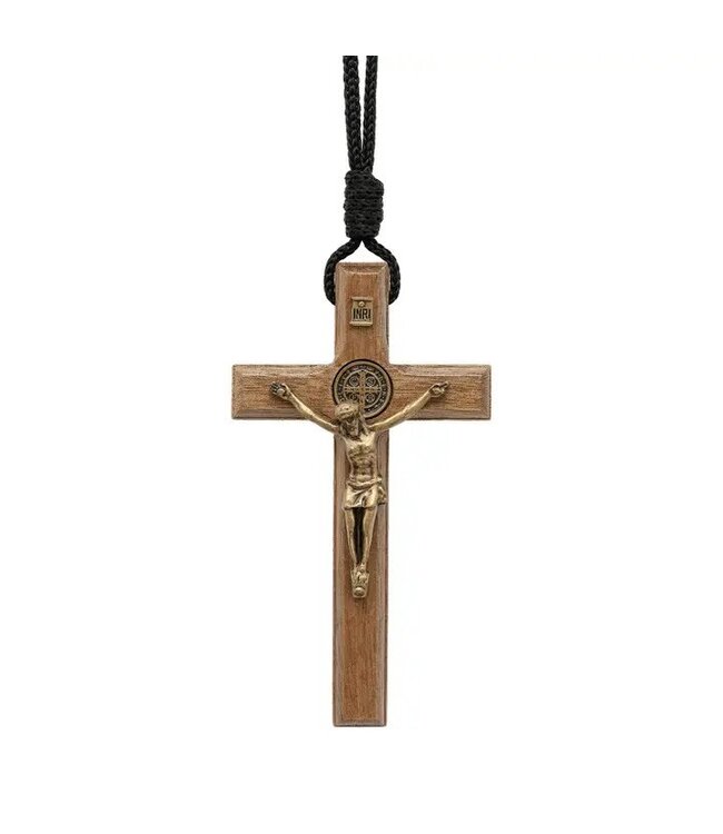 Wooden crucifix pendant necklace featuring a Saint Benedict medal on a cord. 3.5 x 2" pendant on 18" cord.