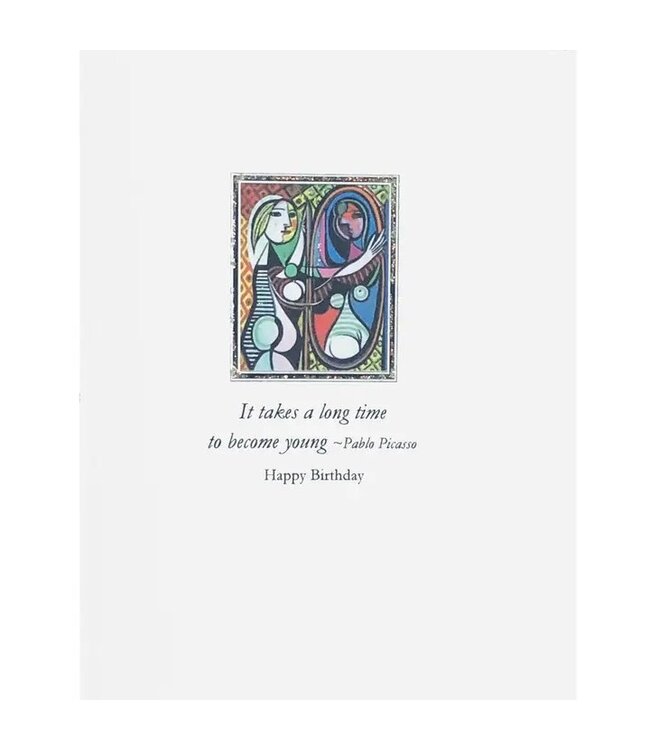 Picasso Birthday Card featuring Girl at Mirror, with greeting "It takes a long time to become young" Greeting card. Hand embellished with fine glitter. Blank inside. Individually sleeved. Size: 4.25 x 5.5 Made in USA.