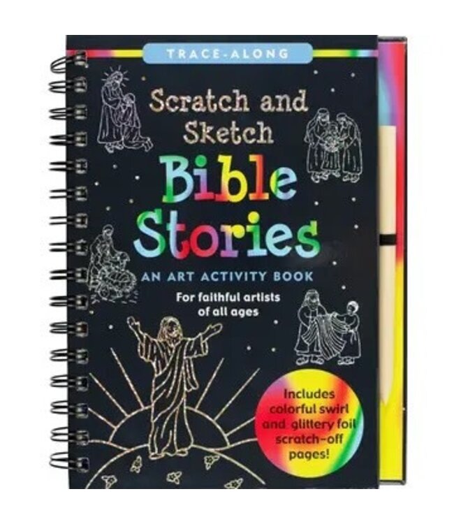 Each timeless story comes alive in swirling colors and glittery foil. Trace Joseph's rainbow coat, Noah's Ark, and more! This is a Trace-Along Scratch and Sketch. White outlines on black scratch-off pages create a fun way for younger children (5 and up) to trace Bible story pictures, revealing patterns, swirls, and holographic colors. They can also use the extra sketch pages in the back to draw their own pictures. A wooden stylus for tracing is shrink-wrapped with the book. Includes 20 black-coated scratch-off pages, 20 illustrated pages with story text, and 20 extra pages for independent drawing and sketching.